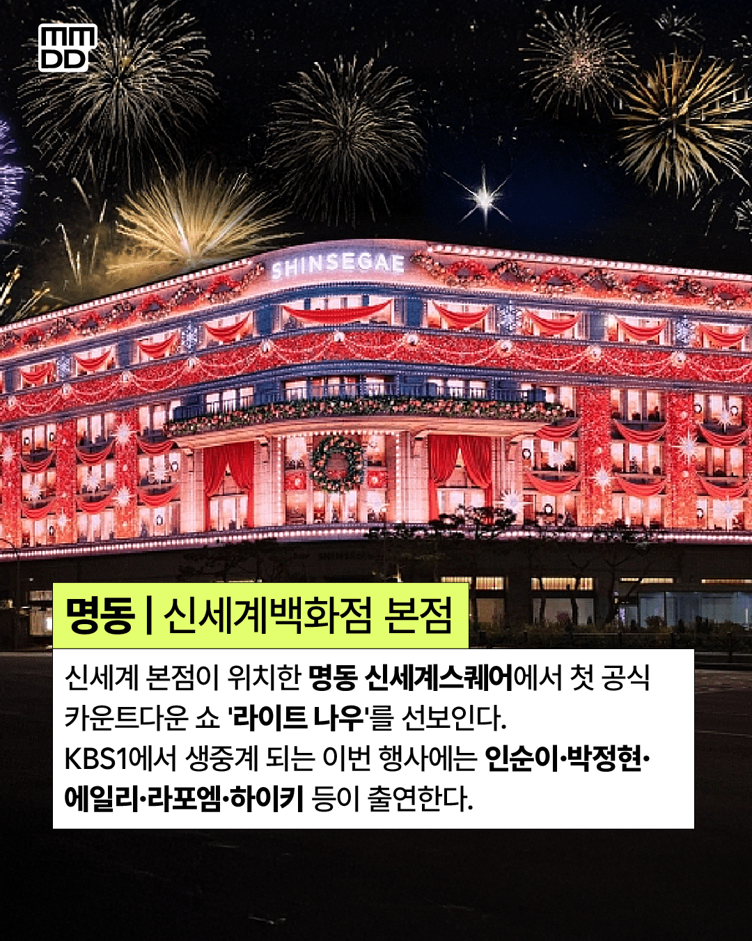 KBS가 제작을 맡은 이번 카운트다운 쇼에는 인순이, 박정현, 에일리, 라포엠, 하이키 등 세대를 아우르는 가수들이 출연하며, 행사는 국내는 물론 117개국으로 생중계된다. 무대는 신세계 본점 분수대 광장과 서울중앙우체국 광장 두 곳에서 관람할 수 있다.