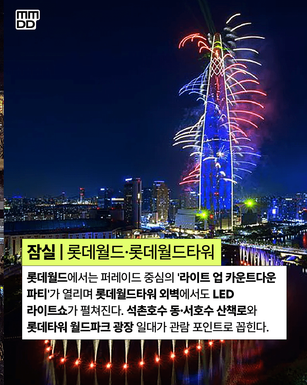 롯데월드타워 외벽에서도 LED 라이트쇼와 불꽃 효과가 동시에 연출된다. 석촌호수 동·서호수 산책로와 월드파크 광장 일대는 대표적인 관람 포인트로 꼽힌다.